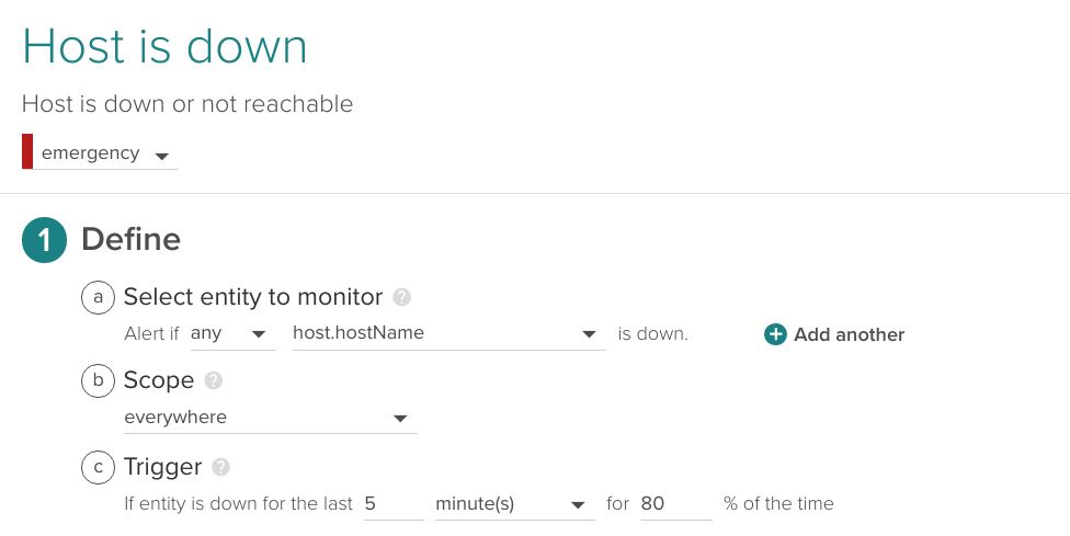 如果主机停机或无法访问,我们希望收到通知。我们将在整个基础架构中应用此单一警报。我们打算给它一个5分钟的等待时间,因为我们不想看到网络连接问题上的嘈杂警报。你可能希望将其降低到1或2分钟,具体取决于你希望接收通知的速度。