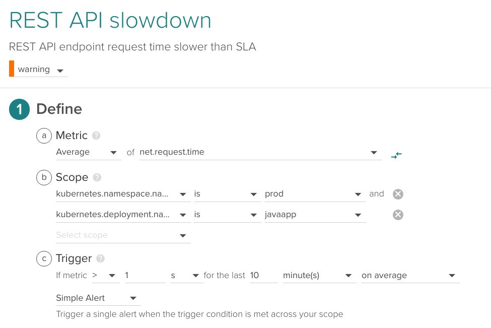 以下示例是一个公共REST API端点监控警报,监控prod命令空间中的名为javaapp的deployment,在10分钟内如果延迟超过1秒则报警。
