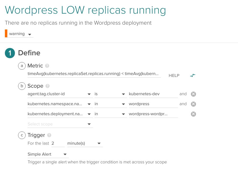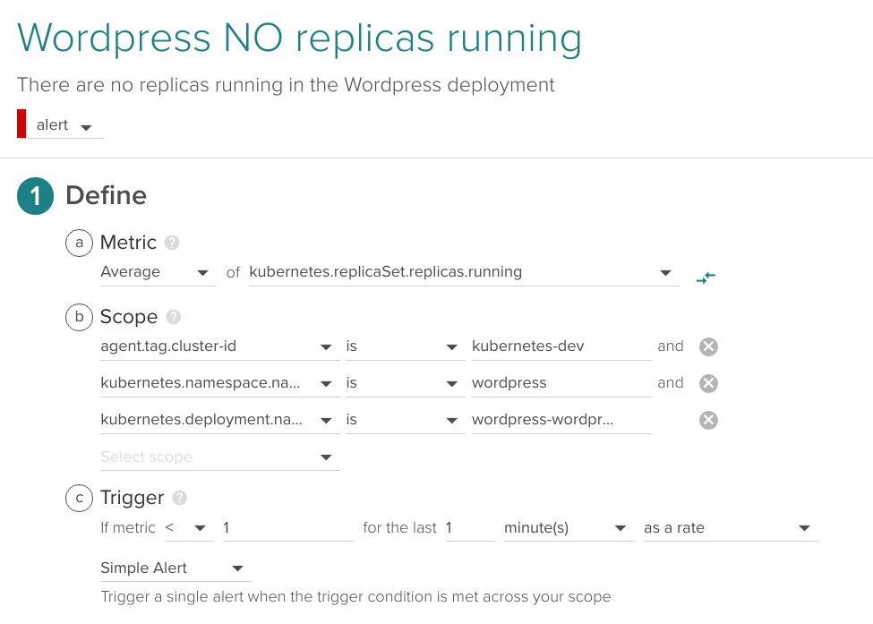 下面是上述报警策略的一个示例,在 wordpress 命名空间中集群 kubernetes-dev 的一个deployment wordpress-wordpress。
