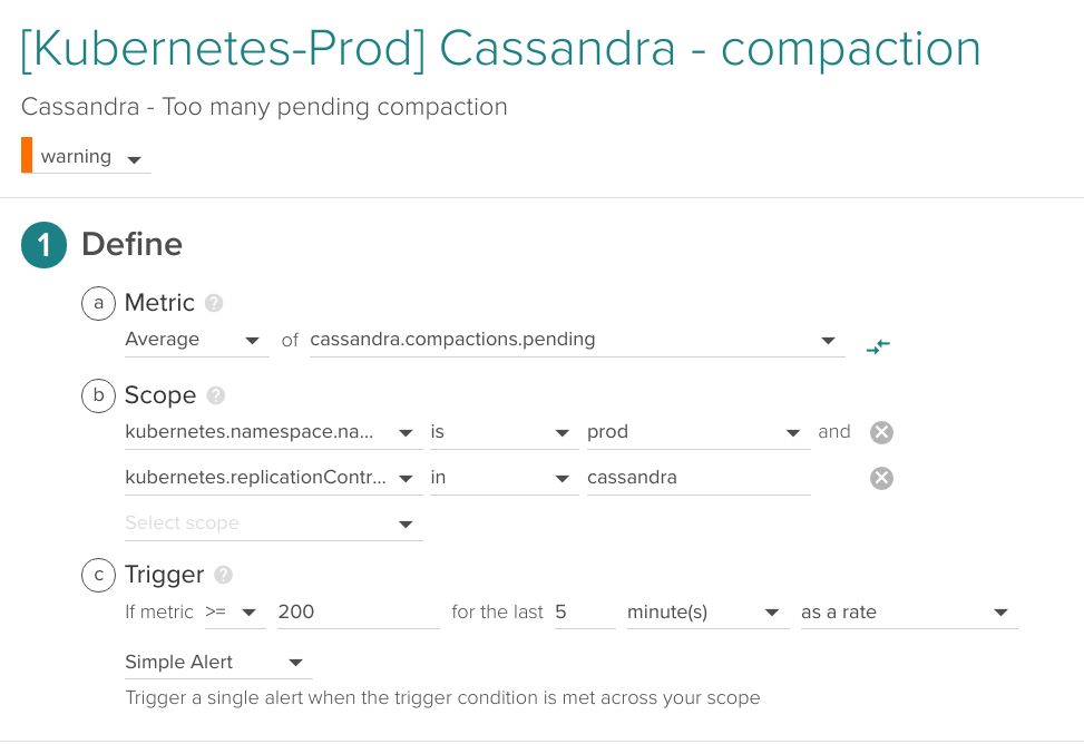 如果我们在Kubernetes、AWS EC2或OpenStack中运行Cassandra,则衡量指标cassandra.compactions.pending存在每个实例上,但是现在我们要查看在prod命名空间内的cassandra复制控制器中聚合的指标。这两个标签都来自Kubernetes,但我们也可以更改范围,包括来自AWS或其他云提供商的标签,例如可用区域。