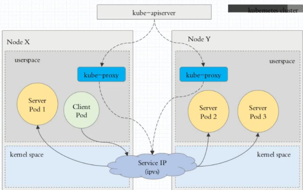 这种模式,kube-proxy 会监视 Kubernetes Service 对象和 Endpoints ,调用 netlink 接口以相应地创建 ipvs 规则并定期与 Kubernetes Service 对象和 Endpoints 对象同步 ipvs 规则,以确保 ipvs 状态与期望一 致。访问服务时,流量将被重定向到其中一个后端 Pod