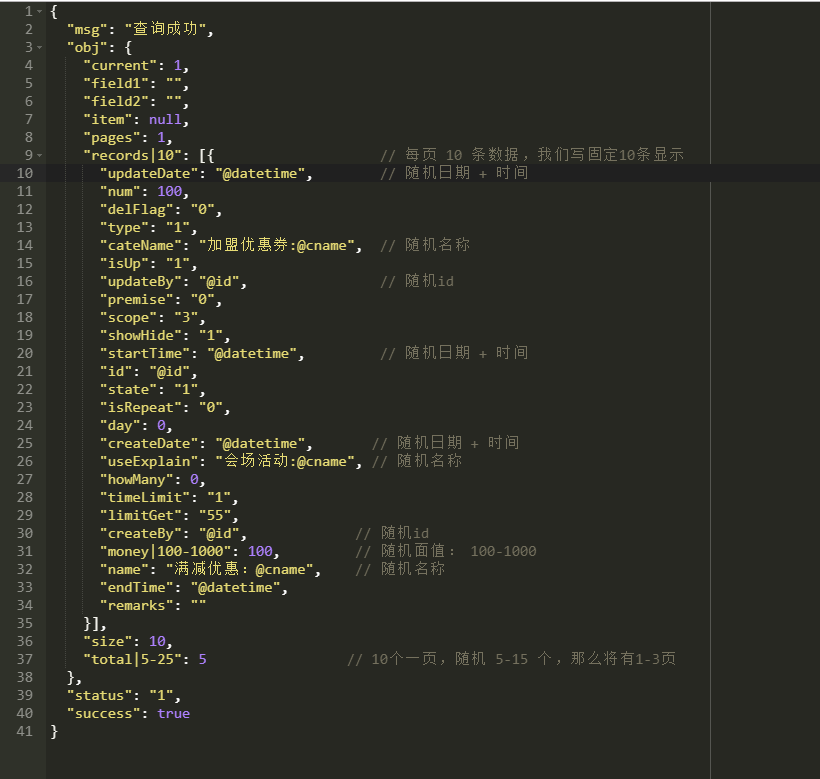 "records|10": [{ // 每页 10 条数据,我们写固定10条显示