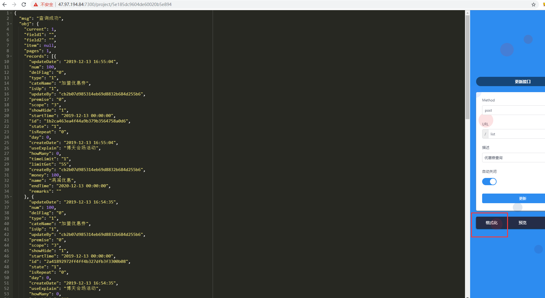 2、粘贴至 mock.js 创建接口,点击一下【格式化】美化您的数据: