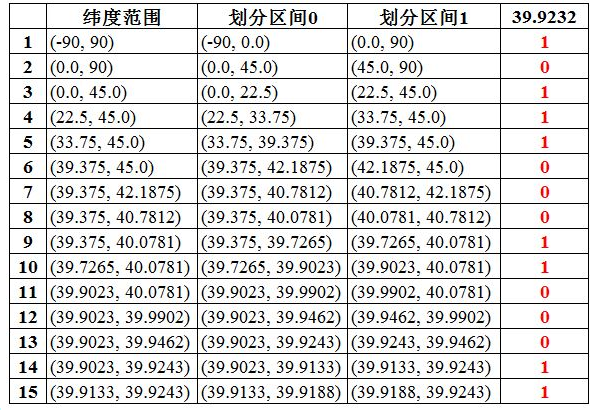 对纬度区间[-90,90]二分,[-90,0]及[0,90],显然纬度39.928167在[0,90]