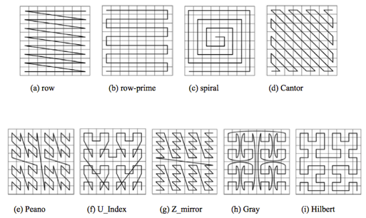 除Peano空间填充曲线外,还有很多空间填充曲线,如图所示,其中效果公认较好是Hilbert空间填充曲线,相较于Peano曲线而言,Hilbert曲线没有较大的突变。为什么GeoHash不选择Hilbert空间填充曲线呢?可能是Peano曲线思路以及计算上比较简单吧,事实上,Peano曲线就是一种四叉树线性编码方式。