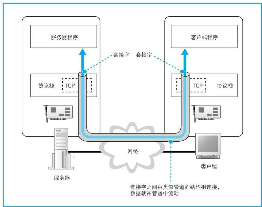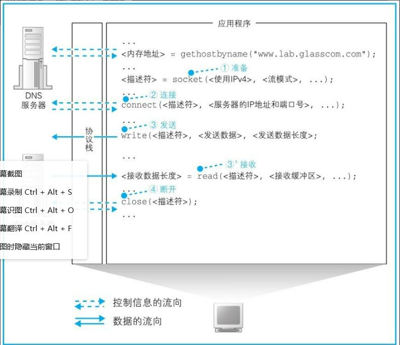 现在我们通过DNS服务知道了接收方的IP地址,以及我们要发送的数据后,我们就需要把消息发送出去,游览器并不具备发送消息的功能,这时候就需要委协议栈来实现向目的地发送消息的功能,简单来说,游览器会通过Socket库中的另一个名为socket程序组件来创建一个数据通道(Socket和socket不一样,前者是库,大写S,后者是程序组件,小写s,实际上不存在这个数据通道,只是比喻,好让人理解),这个数据通道的接口称为套接字(大家可以DOS中输入netstat -ano来查看套接字),之后,应用程序(这里指游览器)调用Socket库中的connect将服务器和游览器的套接字连接起来(一般来说,服务器的套接字从启动时就已经创建完毕,被动的等待客户端的连接)连接起来后就可以进行数据的发送和接收了,发送完数据后还会调用close程序组件来进行套接字的断开(这里说一下,连接双方套接字要进行三次握手,断开则需要四次挥手,现在不理解没关系,之后的博客中会讲到),以下附上一些有关图片,帮助大家理解