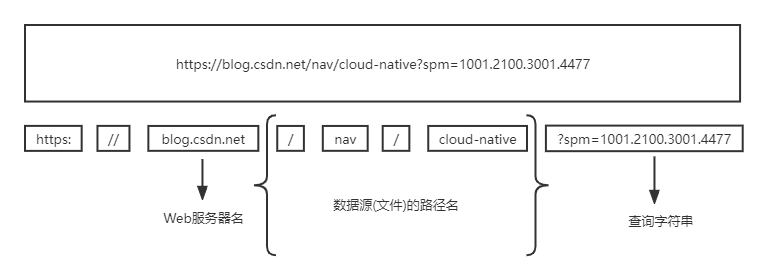 在分析游览器解析网址之前,我们先来看下网址中的各个元素,还是以CSDN为例,https://blog.csdn.net/nav/cloud-native?spm=1001.2100.3001.4477,可将此网址按照以下图片来拆分其元素