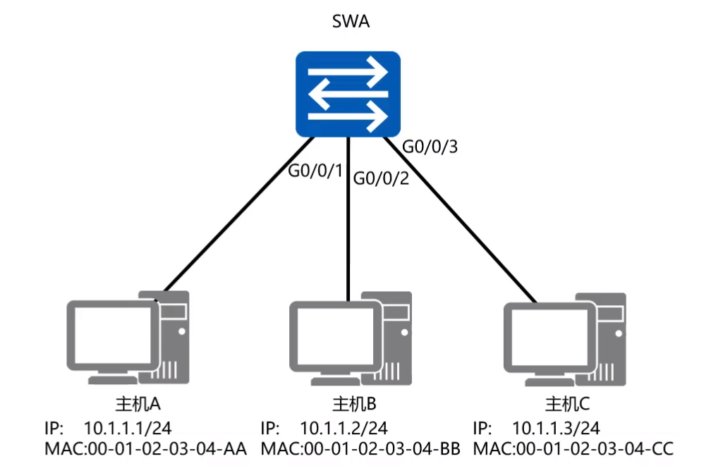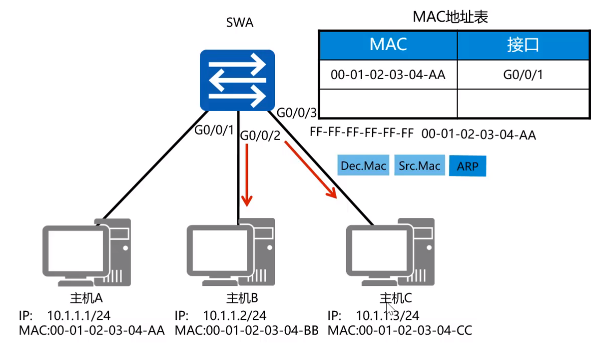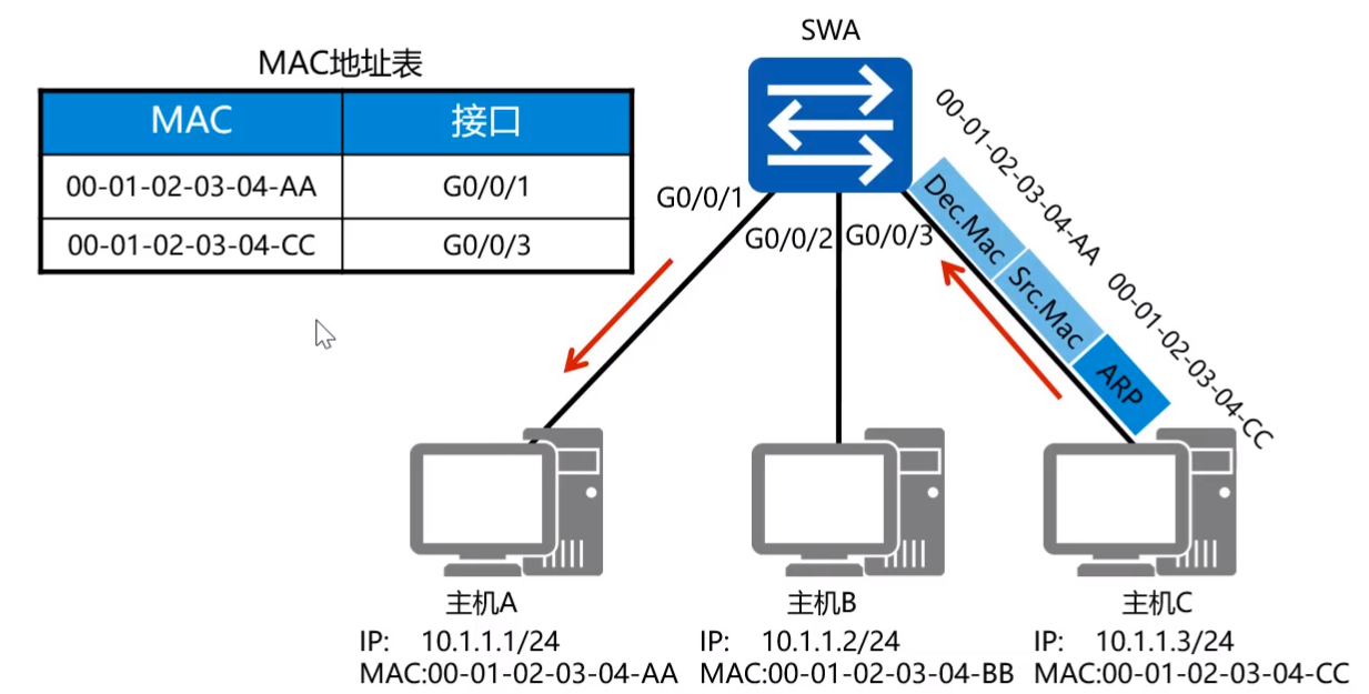 - 交换机内部有一个MAC地址表,MAC地址表中存放着一个MAC地址和交换机端口的映射关系