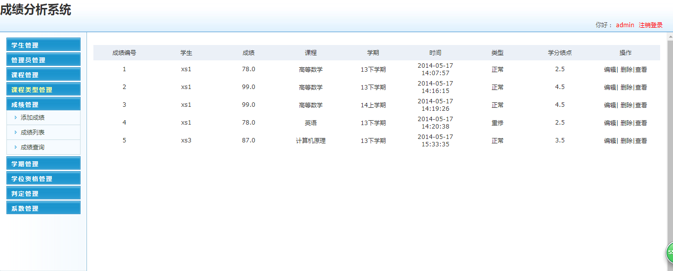 (5)成绩管理:对成绩信息进行添加、删除、修改和查看