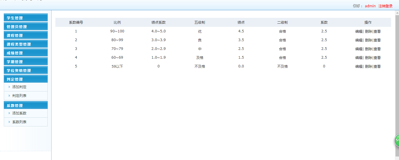 系统的功能角色主要分为,管理员用户以及学生信息。特别说明的是,本系统通过成绩录入,以及并根据录入的设定的评判系数给出相应的判定结果