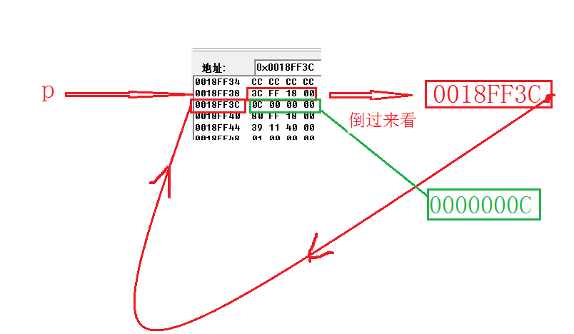 *p解指针。沿着线走下去。p住在0018ff38里面,它的内容是0018ff3c。然后去找0018ff3c,然后0018ff3c里面的的值是 0000000c(12)。*p=12.