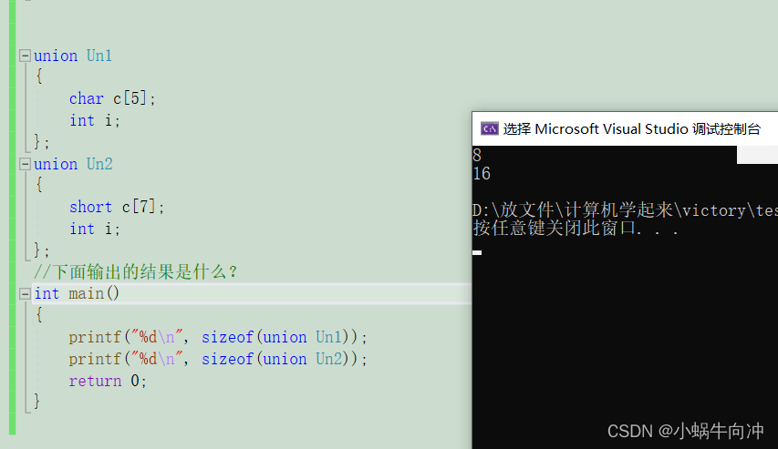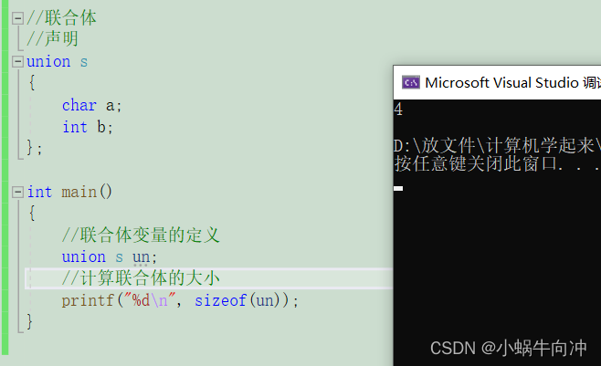 联合的成员是共用同一块内存空间的,这样一个联合变量的大小,至少是最大成员的大小(因为联 合至少得有能力保存最大的那个成员)。