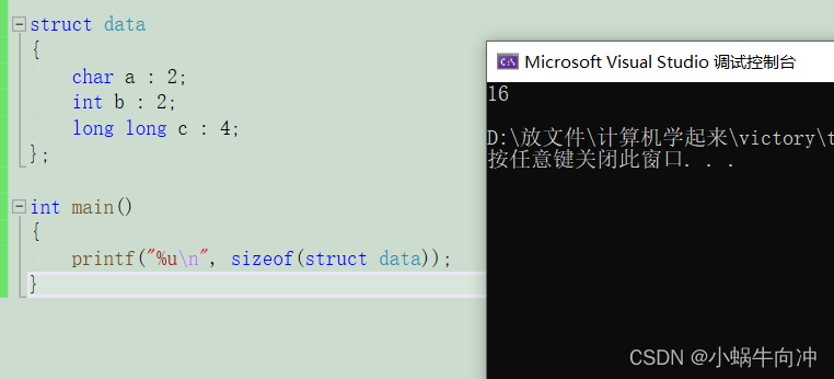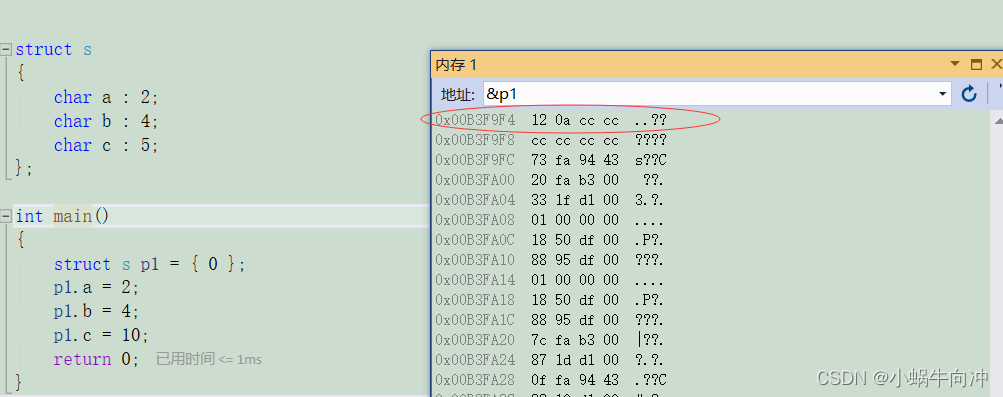 从图中我们可以看出,位段其实就是可以自己分配内存给自己使用。其中" : "后面的数字是分配的给内存几个bit位用来存储成员。(vs的分配方式)