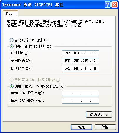 设置我这台PC机的IP地址为192.168.3.2,需要注意的是默认网关为对接的路由器端口的IP地址,即192.168.3.1,子网掩码直接设为255.255.255.0。