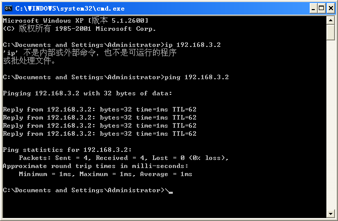 在本机(IP:192.168.3.2)ping另一台PC(IP:192.168.1.1):