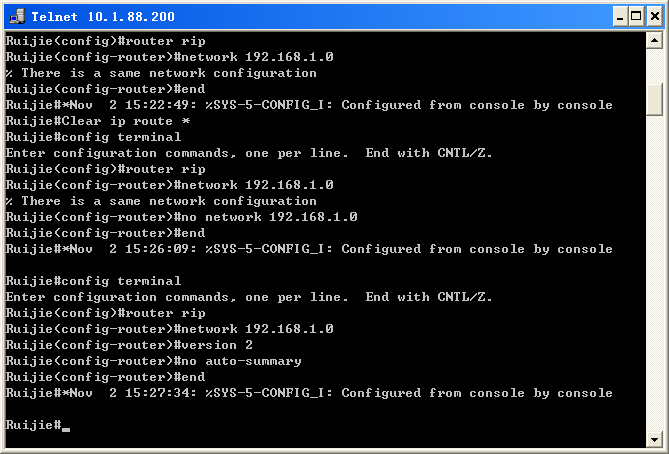 默认情况下,启用 RIP 协议后,IOS 自动以 RIP V1 方式运行,用户不需要特别配置。RIP V2相比RIP V1,仅仅多配下列两条命令,启用RIP V2后要关闭自动汇总功能。