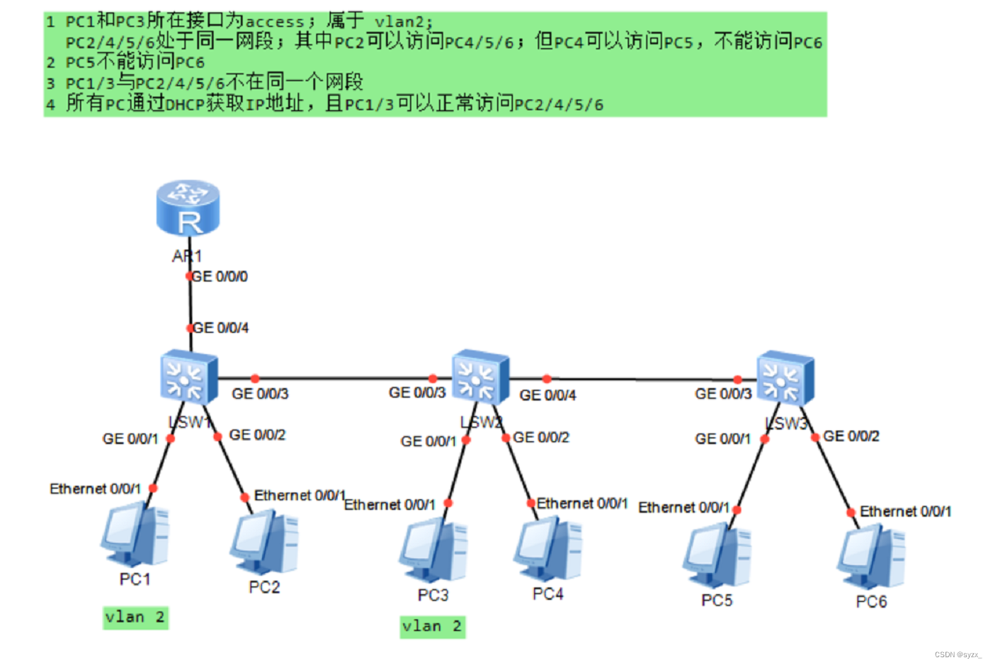PC2/4/5/6处于同一网段﹔其中PC2可以访问PC4/5/6,PC4可以访问PC5,不能访问PC6
