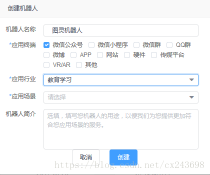 然后我们选择或填写机器人的相关属性,这里我选择的是聊天社交,模拟真人聊天的机器人,应用终端由于是微信公众号接入,机器人设置里面,我们可以拿到接口api相关的信息。。直接上图: