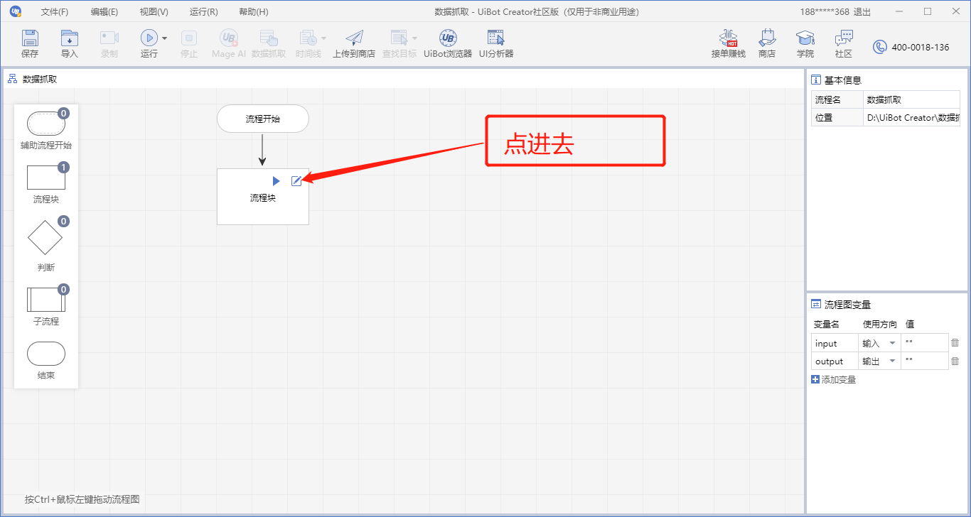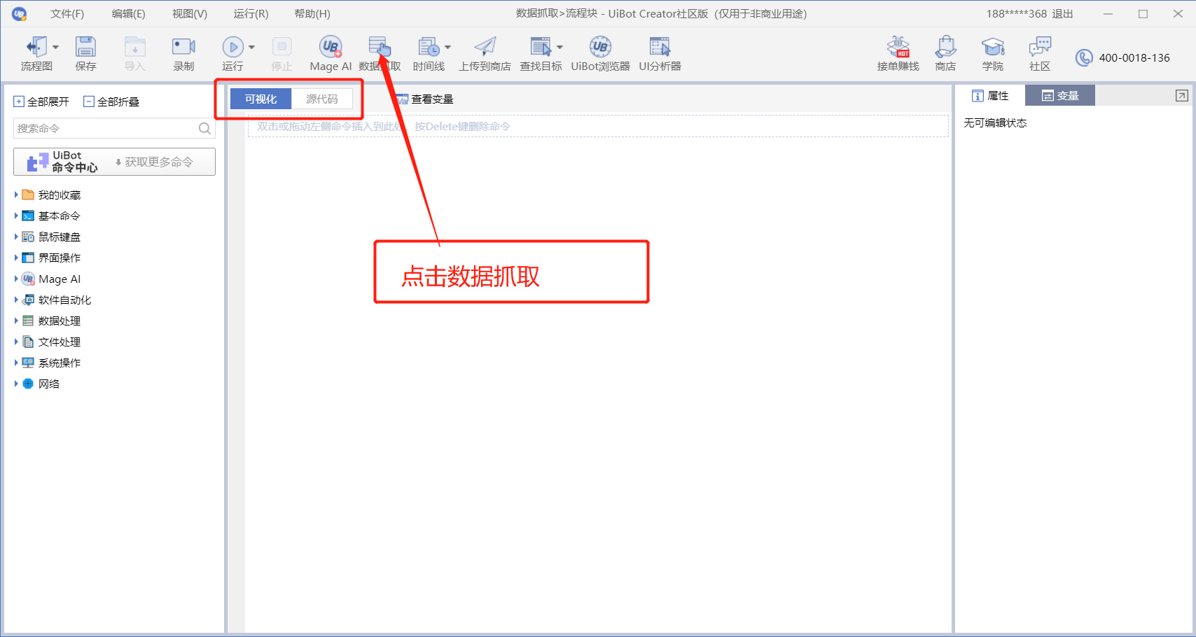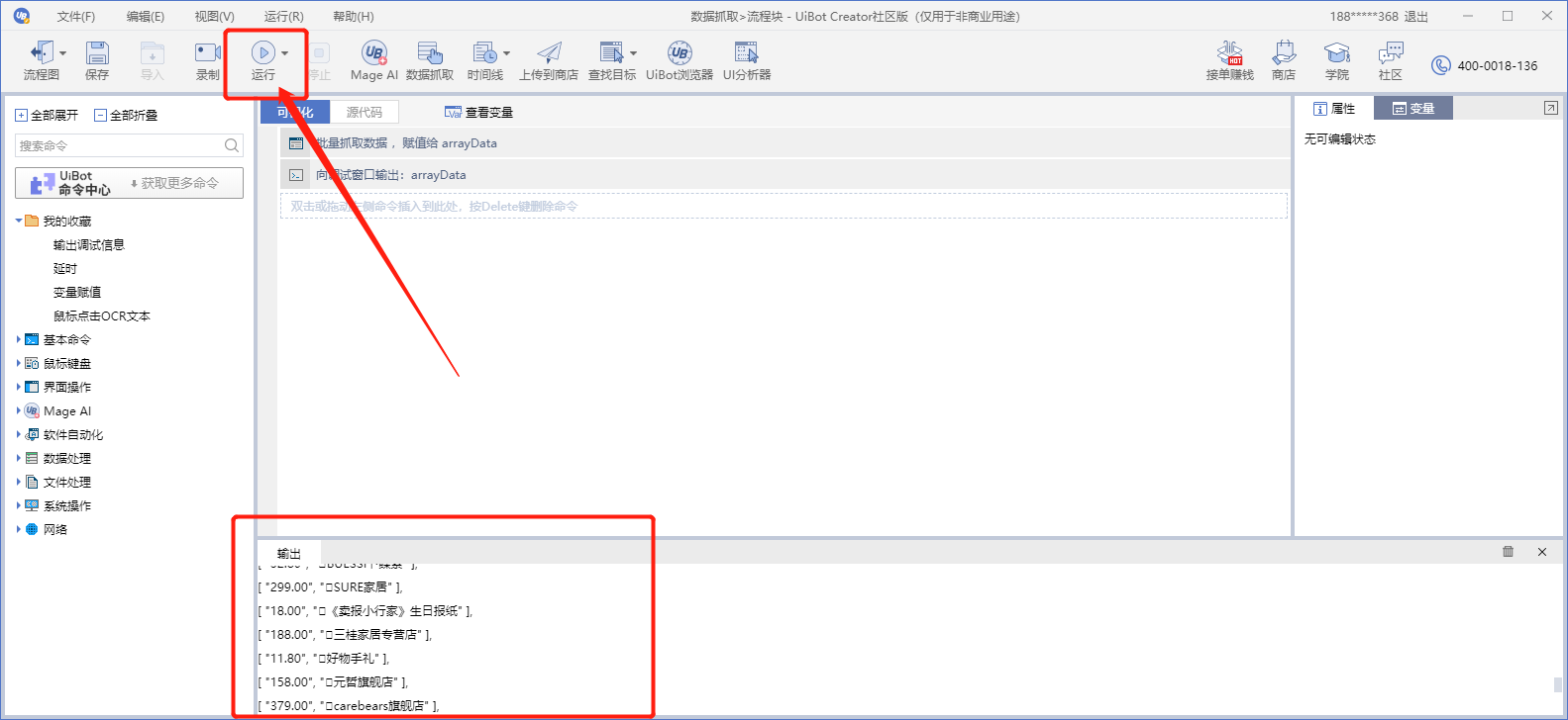 3.启动Uibot,两行代码获取淘宝网商品数据