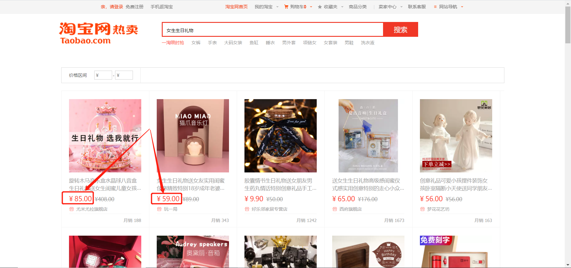 在点击获取数据之前,你需要打开获取数据的网页,我所要获取的是淘宝网上的商品数据,于是便打开了淘宝网站,搜索我想要获取的商品名称,这里我搜索的是女生生日礼物。页面如下: