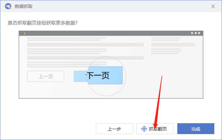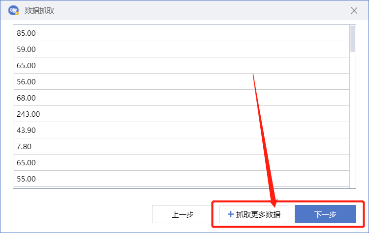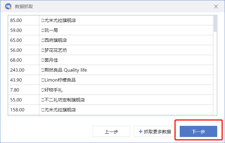 看到网页,选择你想要的数据,比如图中的金额,这时返回Uibot中再点击获取数据那个标签,出现了新页面点击选择目标按钮,选择网页中的金额目标,然后弹出了让你再次选择同一层级的数据目标,也是就上图中两个箭头指向的数据,属于同一层级。获取完金额数据,可以点击获取更多数据选择,再获取其他的数据,我们这里再次获取了旗舰店名称的数据,当然也可以获取更多,看你自己的选择了,之后点击下一步,可以选择点击翻页也可以点击完成,一个是获取更多的页面的数据,另一个是只获取当前页面的数据。具体的过程如下图: