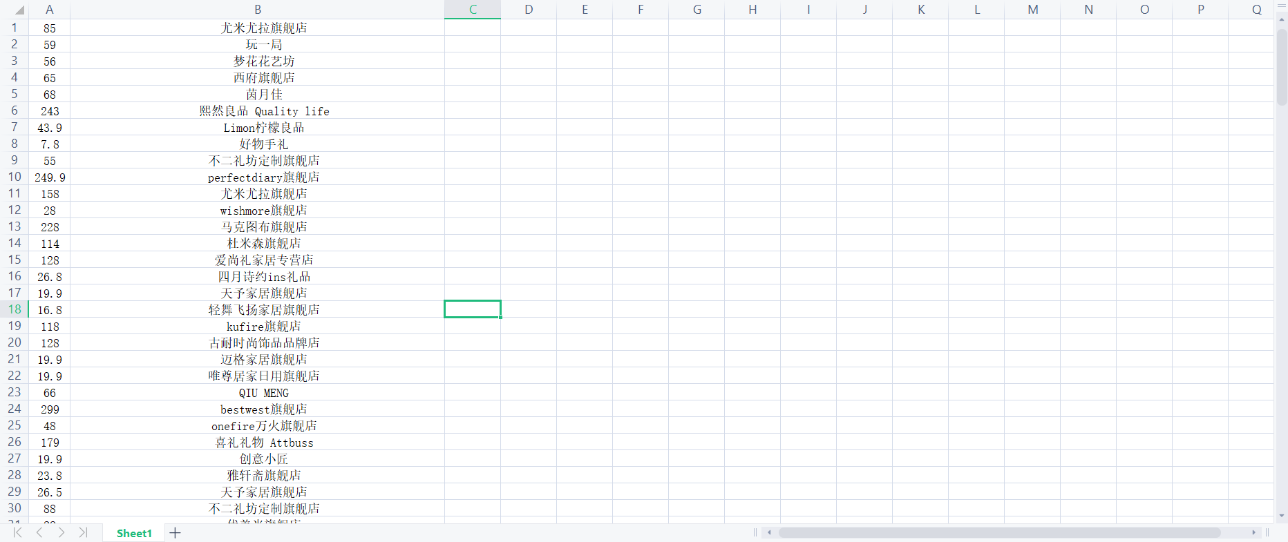 经过以上步骤就可以完成网页数据的抓取了,只有一行代码,这里我只抓取了金额和旗舰店数据,第二行代码就是显示我们抓取的数据,代码有可视化的功能,便于理解,也可以查看源代码,接下来我们就来看看代码及我们抓取的数据吧。