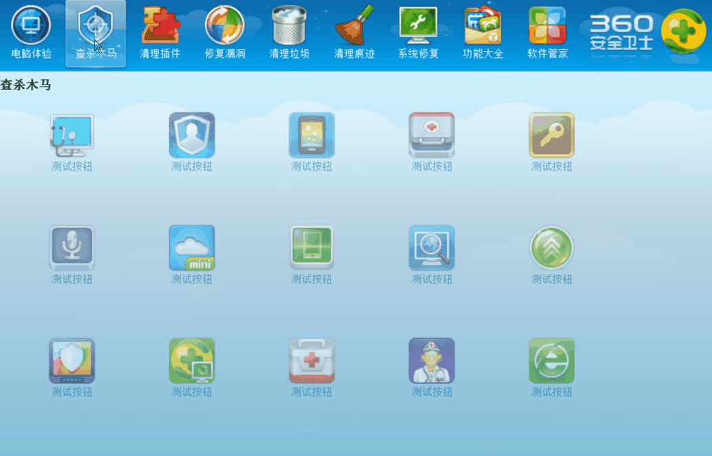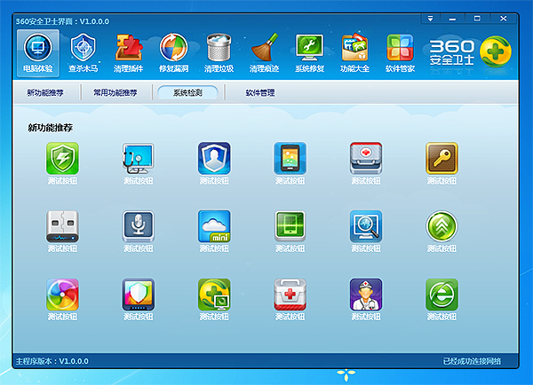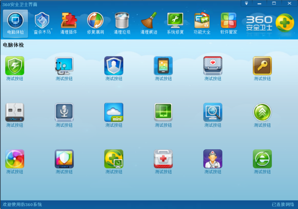 以前学习Windows Form编程的时候,总感觉自己做的界面很丑,看到360安全卫士、迅雷等软件的UI设计都非常美观,心里总是憧憬着要是自己能实现这样的UI效果该多好!!!另一个困扰我的问题是,这个UI皮肤是如何用技术实现的呢?!虽然好多年过去了,但心里的憧憬和疑惑一直没有消失,而且越来越强烈。在日常的工作和学习中,自己在网上也经常留意类似的技术或者文章。最近在学习WPF的过程中,看到网上也有仿360和仿迅雷UI设计的资源,通过对资源的学习和自己的动手实践,终于实现了下面的仿360安全卫士界面: