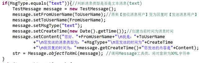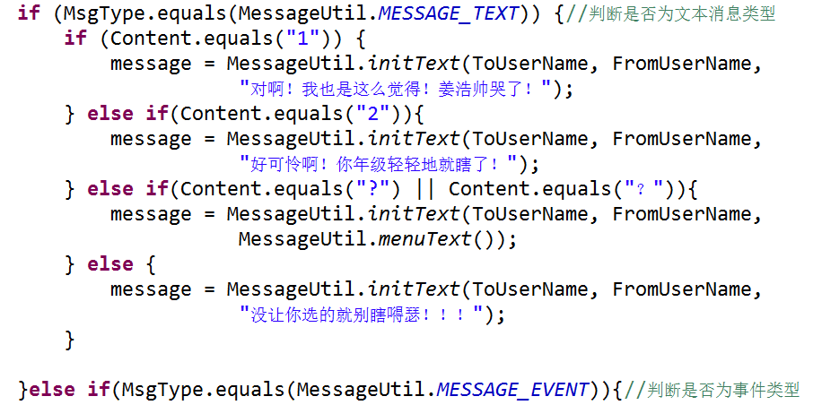 if (MsgType.equals(MessageUtil.MESSAGE_TEXT)) {//判断是否为文本消息类型