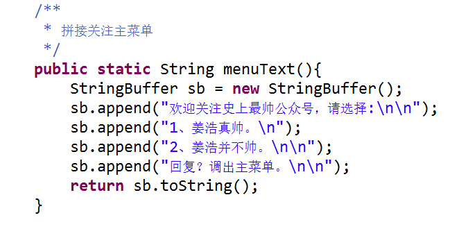 sb.append("欢迎关注史上最帅公众号,请选择:nn");