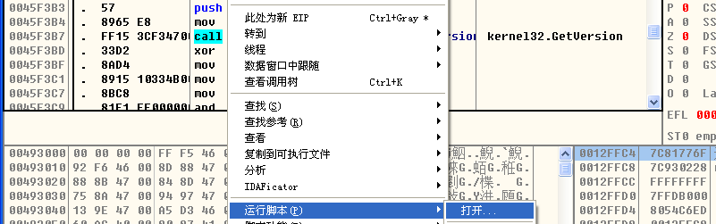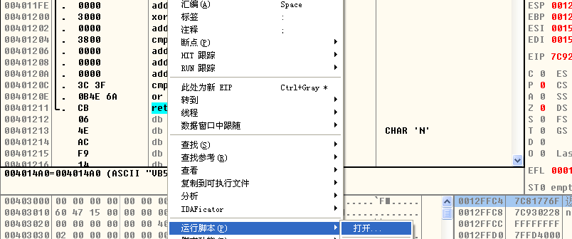 2.回到OD反汇编窗口,点击【右键】,运行脚本打开,选择我们上方保存下来的脚本文件。