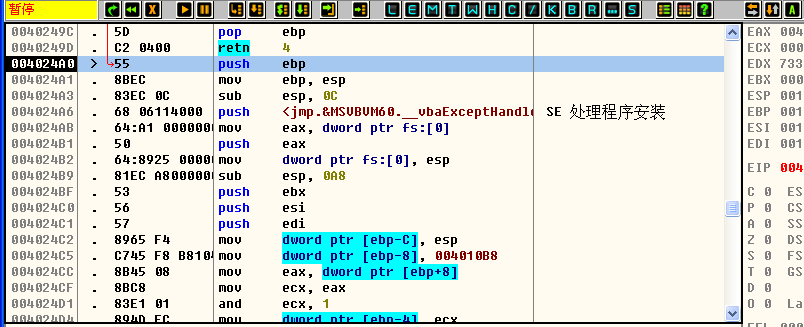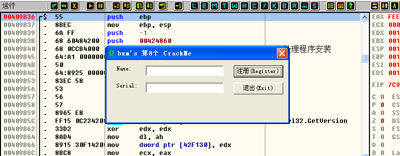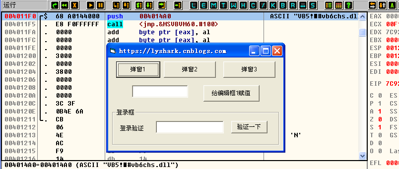 1.OD直接载入CM课件中的【VB6.exe】这是一个VB写的测试程序,我们运行这个程序。