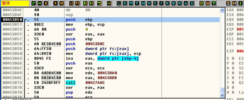 1.OD直接载入CM课件中的【易语言.exe】这是一个易语言写的测试程序,我们运行这个程序。