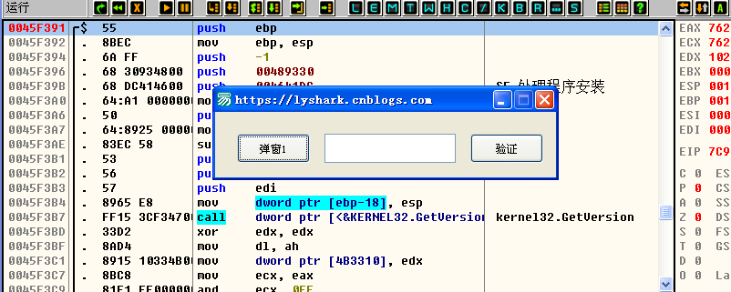 4.运行程序点击,弹窗按钮,程序会断下,直接【F7】进入CALL的内部就能看到按钮的核心代码了。