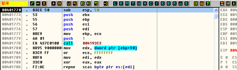 4.回到程序,我们点击【注册按钮】然后程序会断在CALL的位置上,我们直接【F7】进入到CALL的内部,然后在按下两次【F8】
