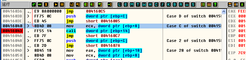 3.程序会跳转到如下位置,我们在跳转后的【00416043】处下断点,VC6只有这一处。