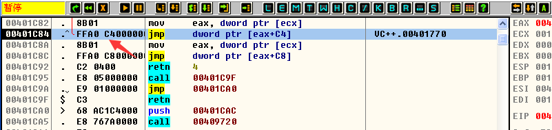 1.OD直接载入CM课件中的【VC++.exe】这是一个易语言写的测试程序,我们运行这个程序。
