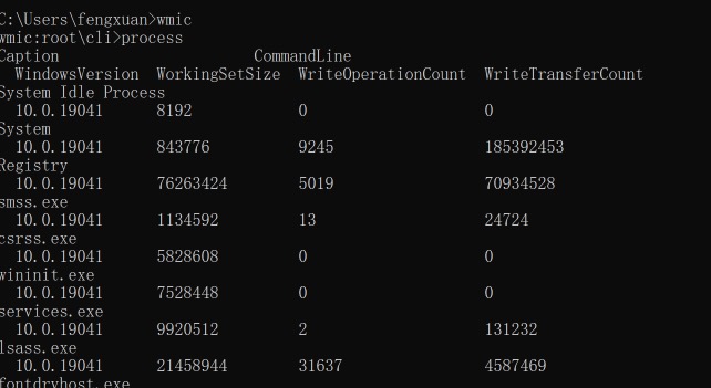 wmic:rootcli>这时,在命令行再输入process, 就可以查看完整的进程信息了。