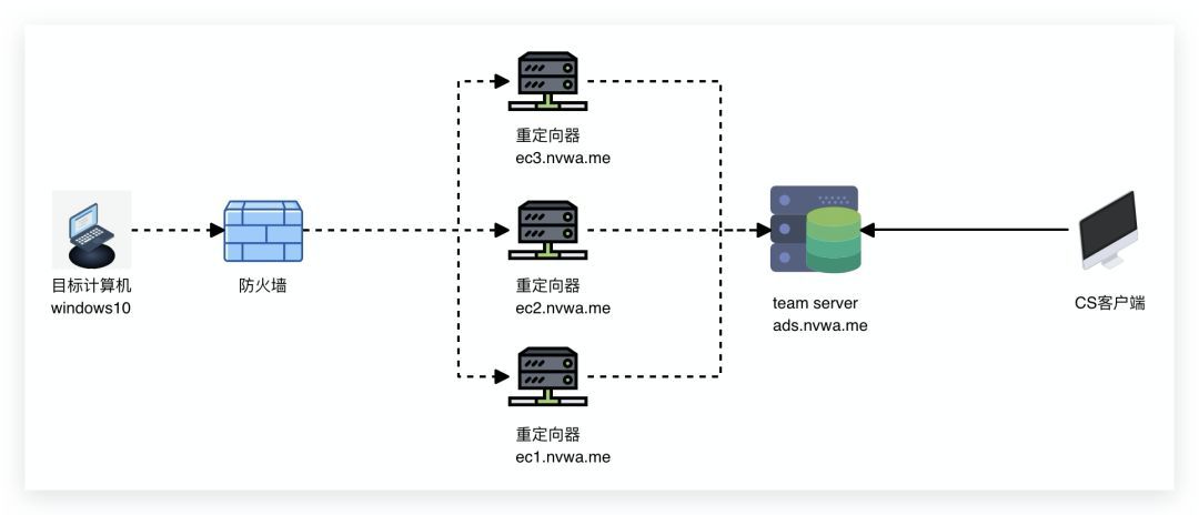 在真实的攻击环境中我们可能并不希望暴露自己的团队服务器,所以我们可以在Team Server前增加几个重定向器以隐藏自己的真实地址,拓扑图如下: