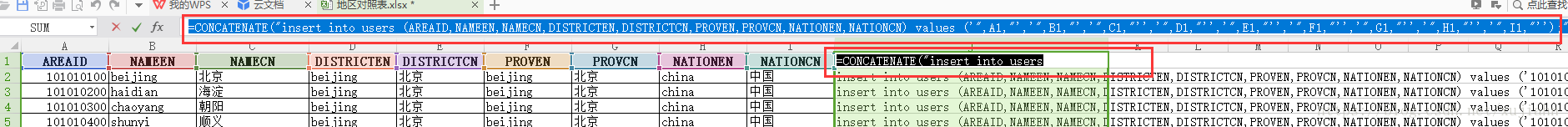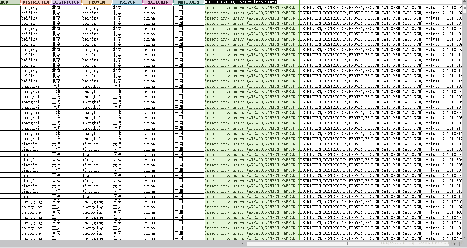 =CONCATENATE("insert into users (AREAID,NAMEEN,NAMECN,DISTRICTEN,DISTRICTCN,PROVEN,PROVCN,NATIONEN,NATIONCN) values ('",A1,"','",B1,"','",C1,"','",D1,"','",E1,"','",F1,"','",G1,"','",H1,"','",I1,"');")