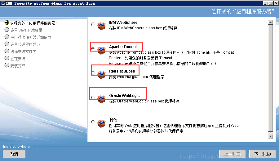 3、启动安装GlassBox安装程序,下一步进行安装:(前提代理服务器需要java环境及运行代理服务器的中间件tomcat、jboos、Weblogic)本地随意使用一种: