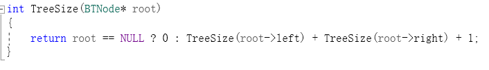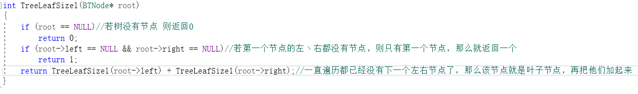 return TreeLeafSize1(root->left) + TreeLeafSize1(root->right);//一直遍历都已经没有下一个左右节点了,那么该节点就是叶子节点,再把他们加起来