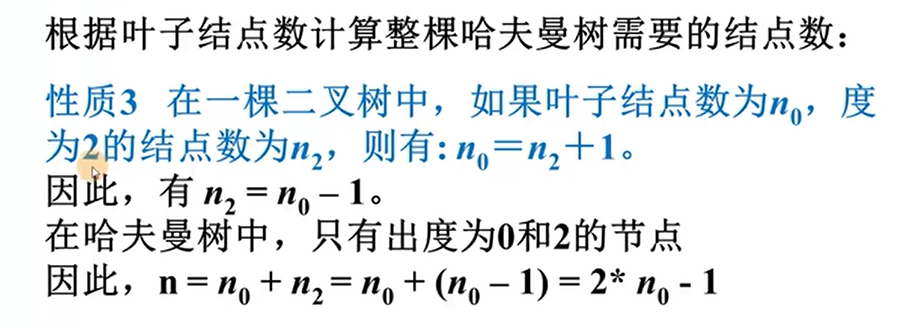 性质 3 :对任何一棵二叉树,若它含有n0 个叶子结点、n2 个度为 2 的结点,则必存在关系式:n0 = n2+1。