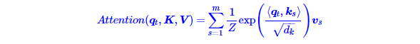 其中ZZ是归一化因子。事实上q,k,v分别是query,key,value的简写,K,V是一一对应的,它们就像是key-value的关系,那么上式的意思就是通过qt这个query,通过与各个ks内积的并softmax的方式,来得到qt与各个vsvs的相似度,然后加权求和,得到一个dv维的向量。其中因子