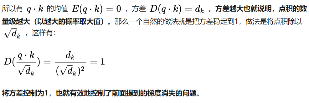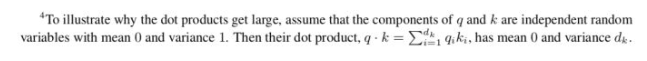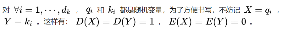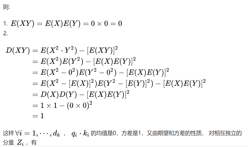 假设向量 q 和 k的各个分量是互相独立的随机变量,均值是0,方差是1,那么点积 q.k 的均值是0,方差是