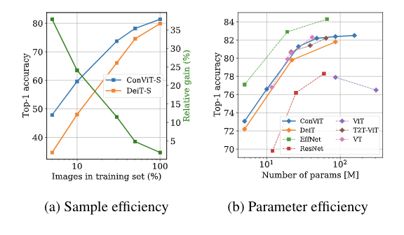 此外,ConViT 在样本效率和参数效率方面也都优于 DeiT。如上图所示,左图为 ConViT-S 与 DeiT-S 的样本效率对比结果,这两个模型是在相同的超参数,且都是在 ImageNet-1k 的子集上训练完成的。图中绿色折线是 ConViT 相对于 DeiT 的提升。研究者还在 ImageNet-1k 上比较了 ConViT 模型与其他 ViT 以及 CNN 的 top-1 准确率,如上右图所示。
