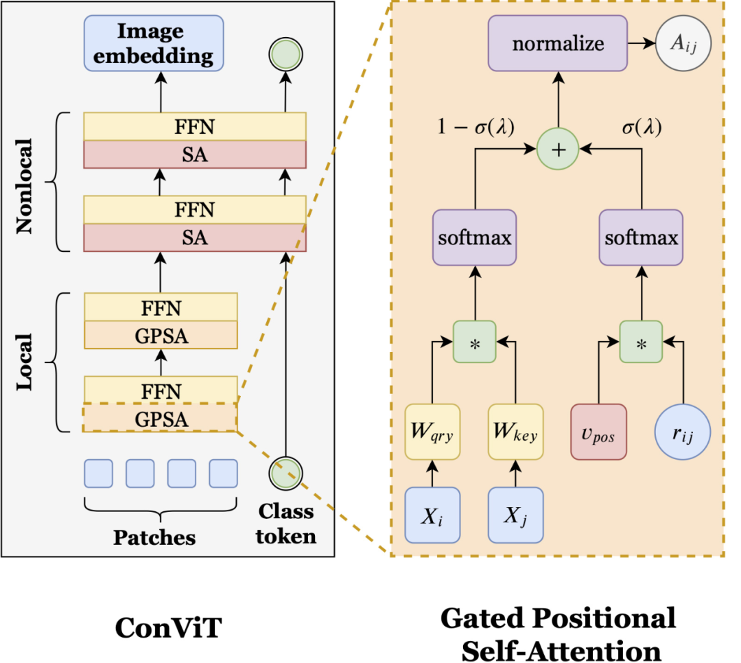 如上图所示,ConViT(左)在 ViT 的基础上,将一些自注意力(SA)层用门控位置自注意力层(GPSA,右)替代。因为 GPSA 层涉及位置信息,因此在最后一个 GPSA 层之后,类 token 会与隐藏表征联系到一起。