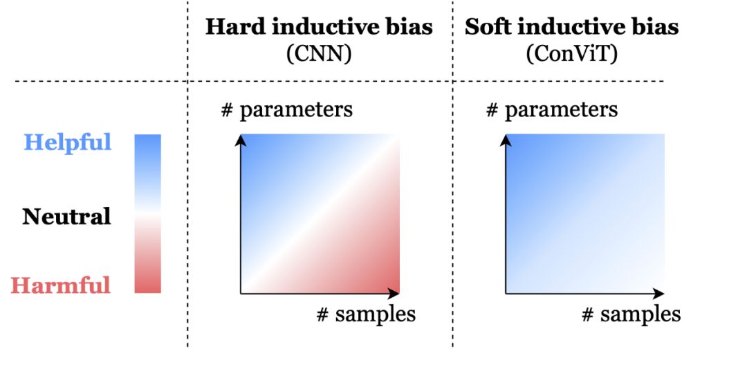 AI 研究人员在构建新的机器学习模型和训练范式时,通常会使用一组被称为归纳偏置(inductive biases)的特定假设,来帮助模型从更少的数据中学到更通用的解决方案。近十年来,深度学习的巨大成功在一定程度上归功于强大的归纳偏置,基于其卷积架构已被证实在视觉任务上非常成功,它们的 hard 归纳偏置使得样本高效学习成为可能,但代价是可能会降低性能上限。而视觉 Transformer(如 ViT)依赖于更加灵活的自注意力层,最近在一些图像分类任务上性能已经超过了 CNN,但 ViT 对样本的需求量更大。