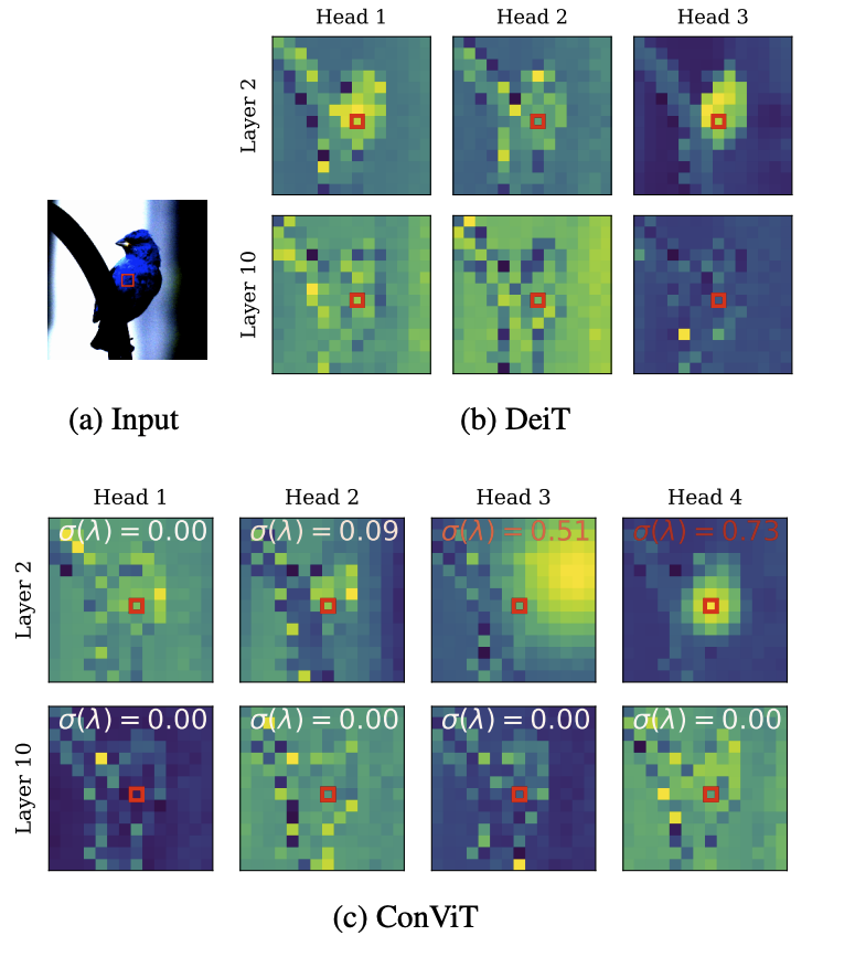 上图展示了 DeiT (b) 及 ConViT (c) 注意力图的几个例子。σ(λ) 表示可学习的门控参数。接近 1 的值表示使用了卷积初始化,而接近 0 的值表示只使用了基于内容的注意力。注意,早期的 ConViT 层部分地维护了卷积初始化,而后面的层则完全基于内容。